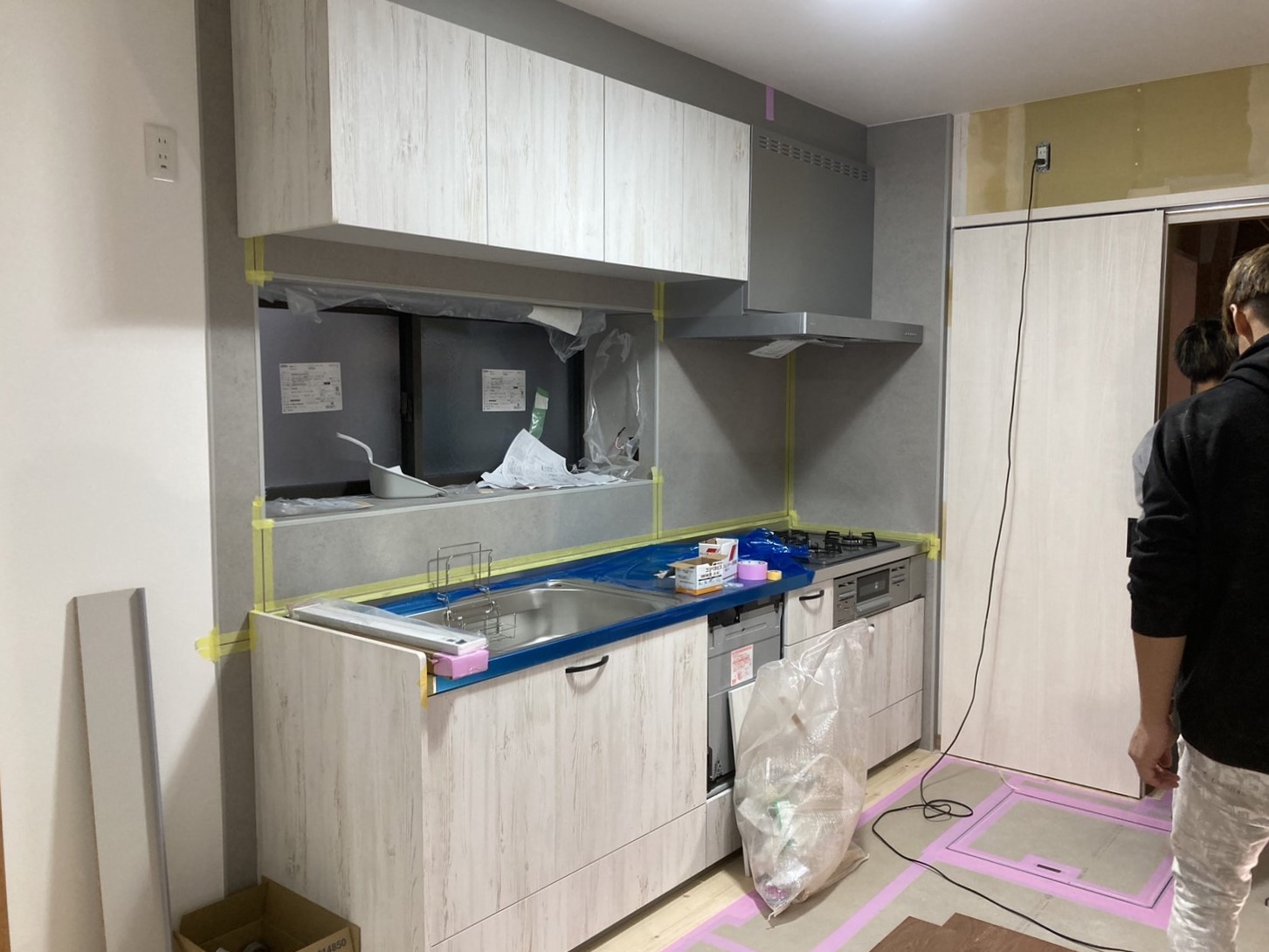 一日雨でしたが、今日はキッチン取り付け作業をはじめとした内装工事だったので、まだ影響なく仕事が進みました。