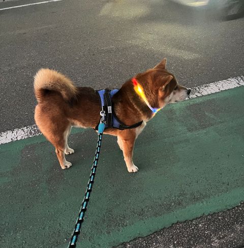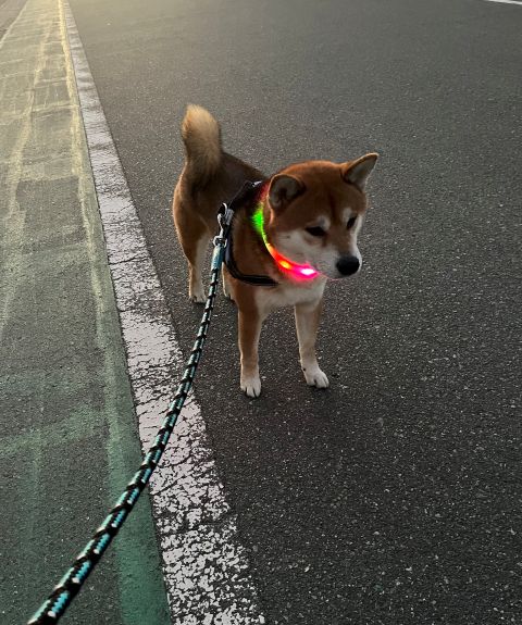 暗くなっても帰宅拒否を続けるので、夜道対策に光る首輪を装着。