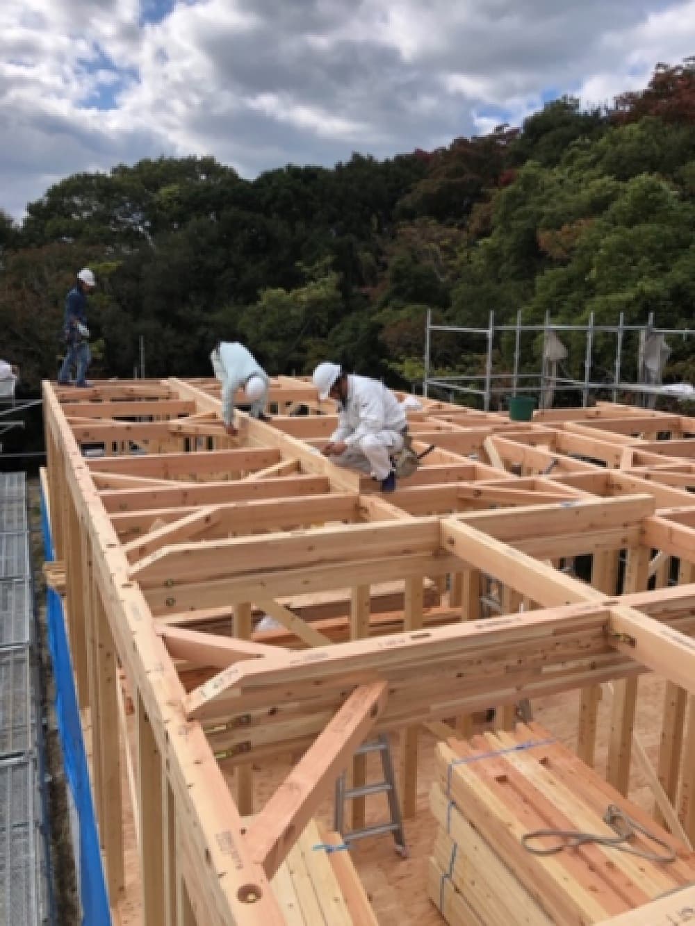 淡路市m様棟上げ工事を行いました。材木を施工する場所に配置していきます。