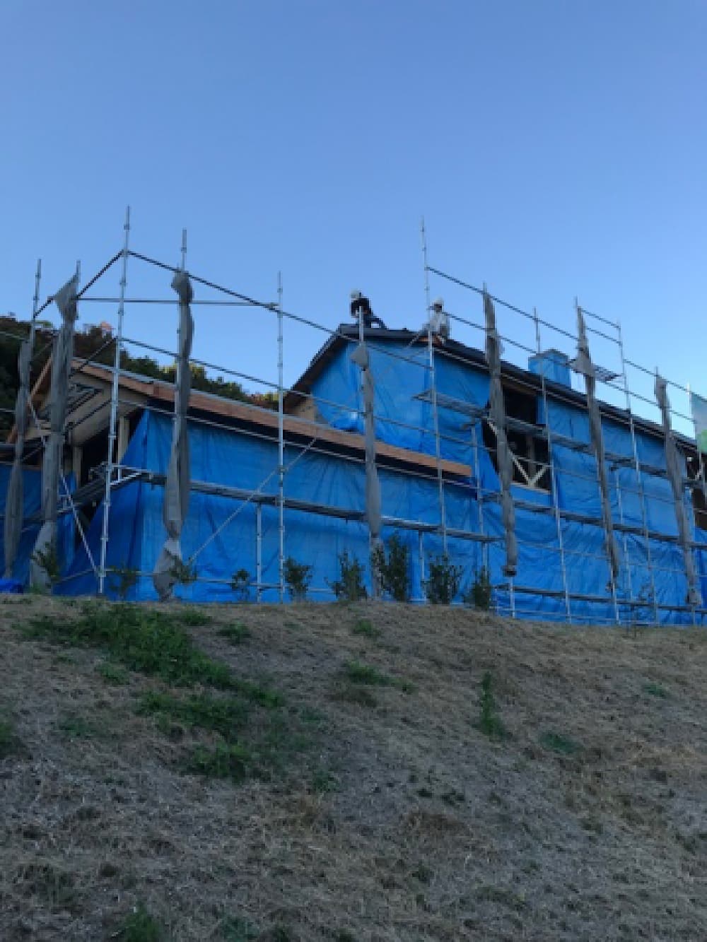 野地板を施工した後ブルーシートで雨養生をします。これで棟上げ完成です。